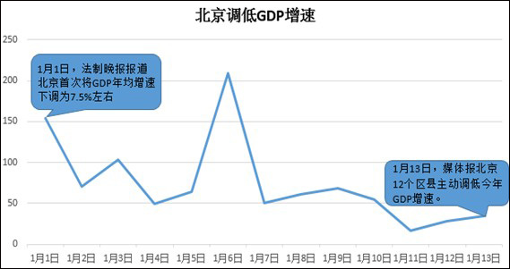 自2014年1月1日法制晚报报道北京首次将GDP年均增速下调为7.5%后,新华网、人民网、新浪财经、网易财经等多家媒体接连对其进行分析报导,百度搜索相关新闻结果约5,090,000个,一石激起千层浪,社会各界对北京缘何会进行调低GDP发出质疑。