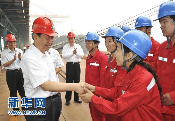 7月17日至18日,中共中央政治局常委、国家副主席习近平在河北省唐山市考察工作。这是7月18日,习近平在曹妃甸港区25万吨级矿石码头考察时与工人握手。新华社记者黄敬文摄