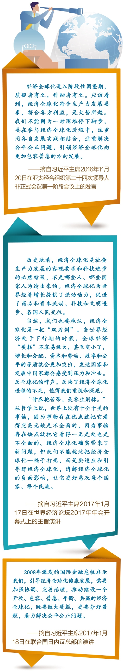 【核心提示】 目前,国际逆全球化思潮涌动,一些人把当前世界发展中面临的主要问题归咎于经济全球化,民粹主义、排外主义、贸易和投资的保护主义抬头。然而,经济全球化是发展的客观规律决定的,并不以个人或某国的意志而改变。