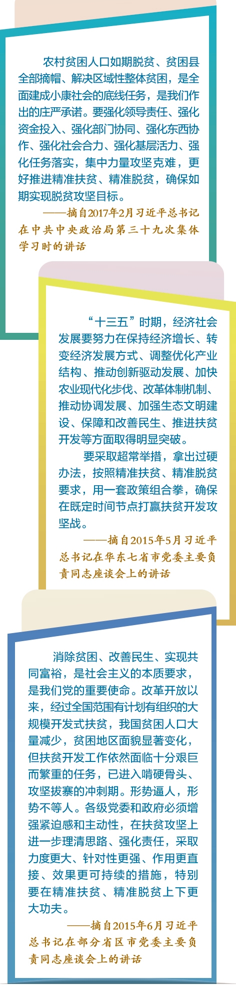 【编者的话】 消除贫困、改善民生、实现共同富裕,是社会主义的本质要求。党的十八大以来,党中央对脱贫攻坚作出新的部署,吹响了打赢脱贫攻坚战的进军号,脱贫攻坚取得显著成绩。现在,我们进入扶贫开发工作攻坚拔寨的冲刺期,我们要深入学习贯彻习近平总书记关于扶贫开发工作的重要讲话精神,把握好脱贫攻坚正确方向,科学谋划好扶贫开发工作,扶真贫、真扶贫,确保在既定时间节点完成脱贫攻坚任务。
