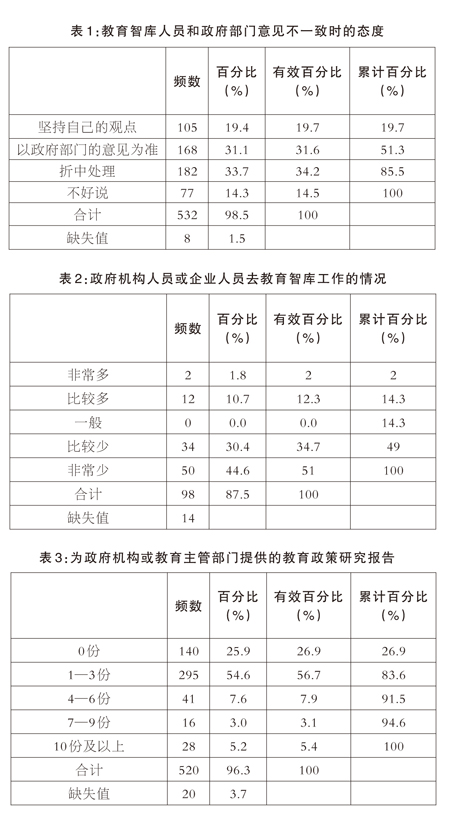 由此可以看出,由于教育智库和教育智库人员由政府财政支持,在研究过程中较难偏离政府的要求,往往由政府部门指定研究主题,教育政策研究明显带有政府指导的色彩。从某种程度来讲,这些教育智库和教育智库人员的研究独立性与前瞻性容易受到影响。此次调查显示,当教育智库人员和政府部门意见不一致时,坚持自己观点的教育智库人员仅占19.4%,以政府部门意见为准的占31.1%,选择折中处理的教育智库人员占33.7%(见表1)。