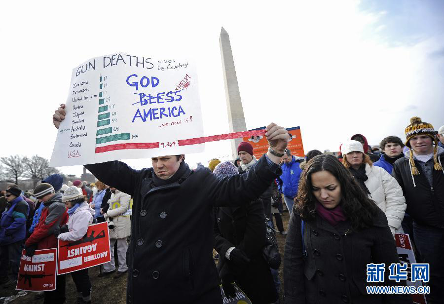 (美国民意在多个议题上尖锐对立,如在枪支管控上,一方要求限枪,一方坚称拥枪权利不可侵犯。图为在美国首都华盛顿,人们举着要求控制枪支的标语牌集会。新华社记者 张军 摄)
