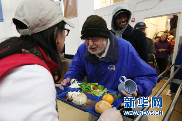 (美国收入极化加剧财富“鸿沟”,在25%的大城市,中产阶级不再是主流。图为在美国旧金山,志愿者向一名男子发放午餐。新华社发)
