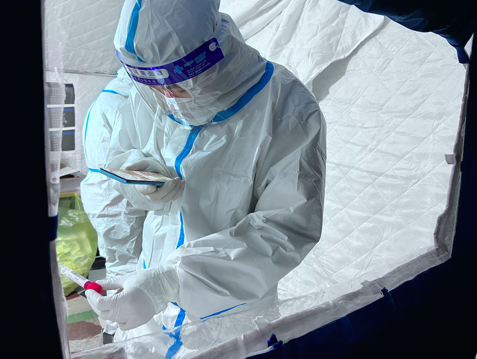 不到半个小时,顾杨和三位同事就麻利地穿好防护服,在核酸采样的帐篷里,连同招募的居民志愿者,开始了采样。核酸检测台迅速从1个增加到了4个,大大提高了核酸检测的效率。