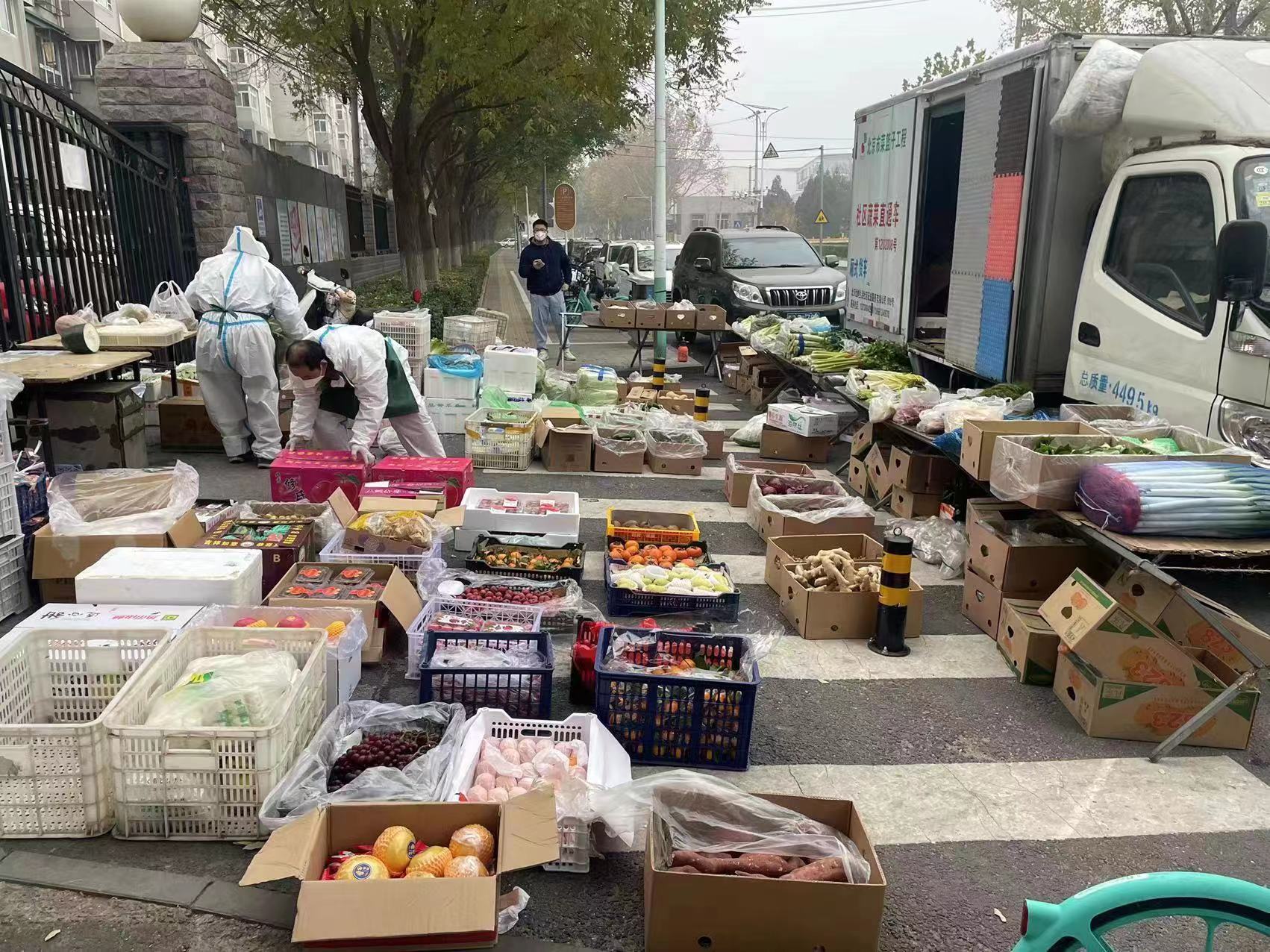 11月24日早8时,一辆蔬菜直通车开到了久居雅园小区北门外,各种新鲜的蔬菜、水果分门别类地排开,满满当当摆了一地,几个外卖快递架子也已经迅速搭好,按楼序整齐排放。而此时,离小区接到封控通知,仅仅过去了3小时。